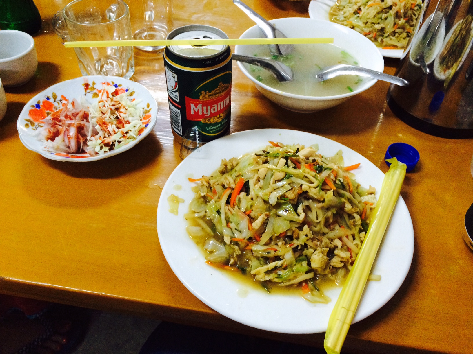 Lunsj på en enkel gatekafe. Nudler stekt i olje med kylling og grønnsaker, pluss en liten skål suppe. Øl solgte de ikke, men hentet til oss fra kjøpemannen over gata. Enkelt kjøkken, men likevel smakfullt og godt.
