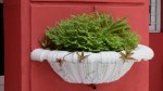 - En grønnmalt benk o et rødt nattbord på fortauet.