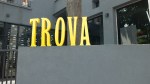 - Sober grått bygg med sterkt gule bokstaver på restauranten.