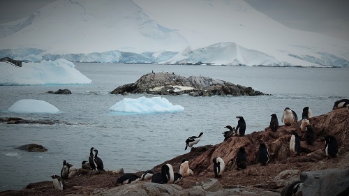Til venstre ser vi gentoo-pingviner. Midt i bildet bakerst er det kongeskarv, som nesten ser ut som pingviner i sin svarte og hvite fjærdrakt. Og helt til høyre er adelie-pingvinen.