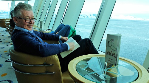 Fra dekk sju har vi en fantastisk utsikt over isfjell, hval, sel og pingviner. Og innimellom kan vi lese litt også. Her er det Ernst Larsen som leser.