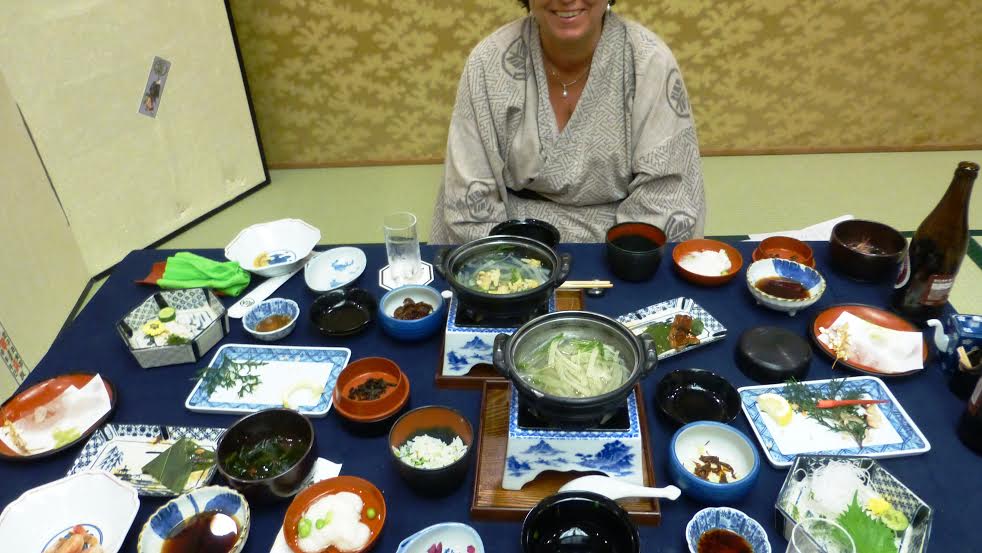 Middagen i vår roykan består av uendelig mange retter. Legg merke til at Reiseruud er kledt i kimono.
