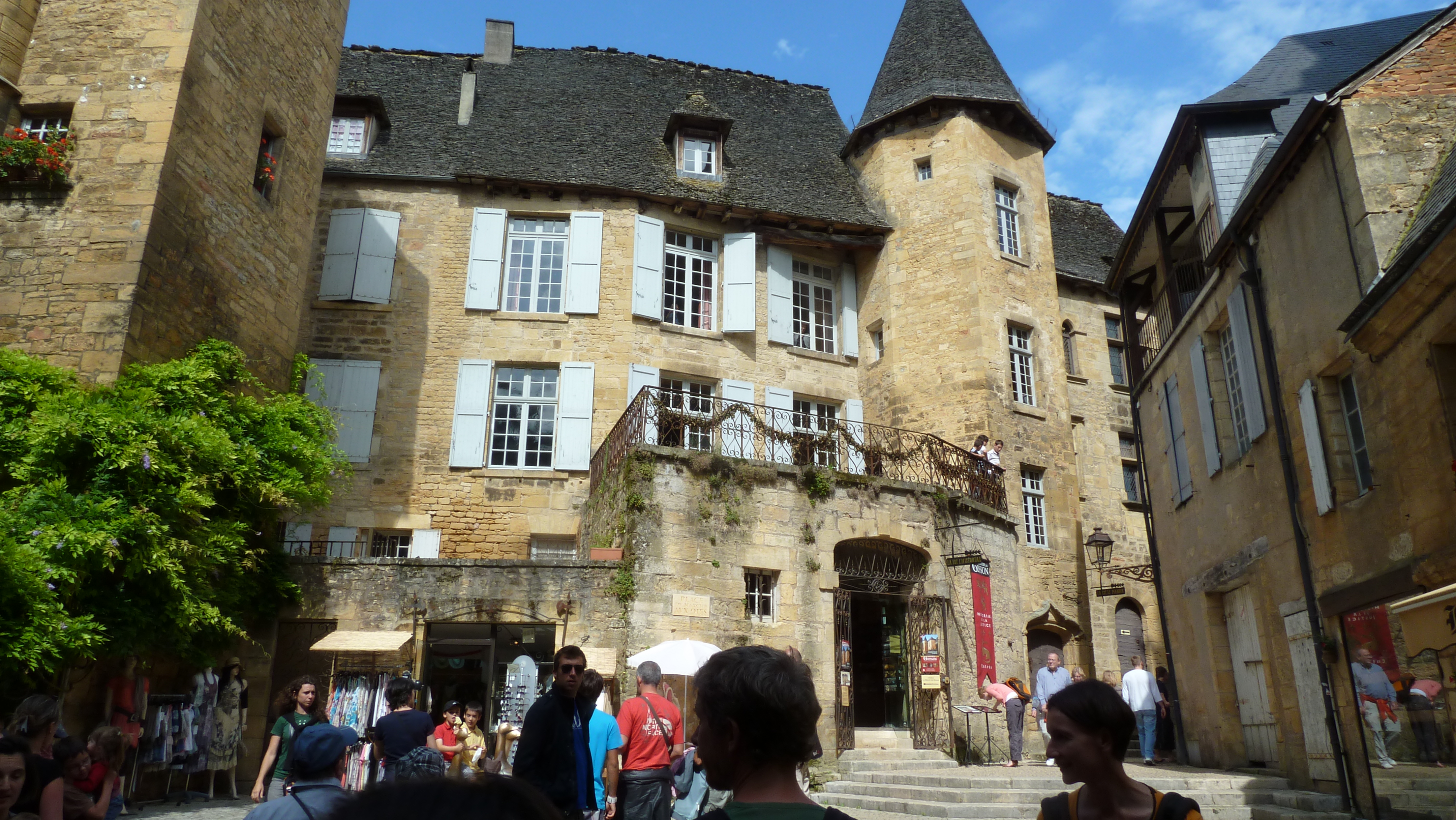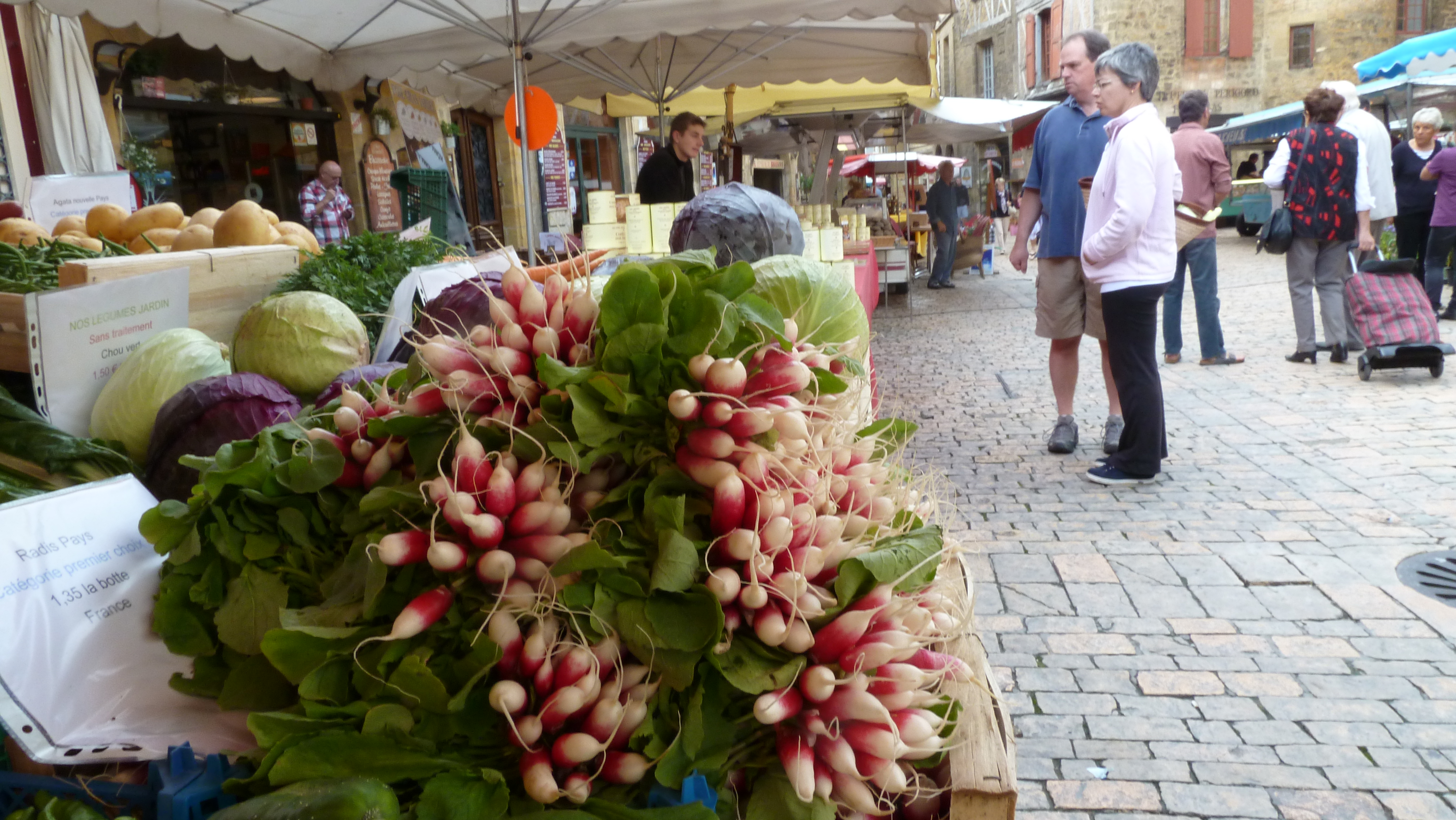 Landsbyen Sarlat regnes som Frankrikes vakreste, og er et av overnattingsstedene på turen. Og det var den virkelig. Hele byen er bygget i gulgyllen sandstein. Det er artige butikker og mye god mat å se, smake og lukte på. Et eget matmarked hadde fått plass i en gammel kirke.