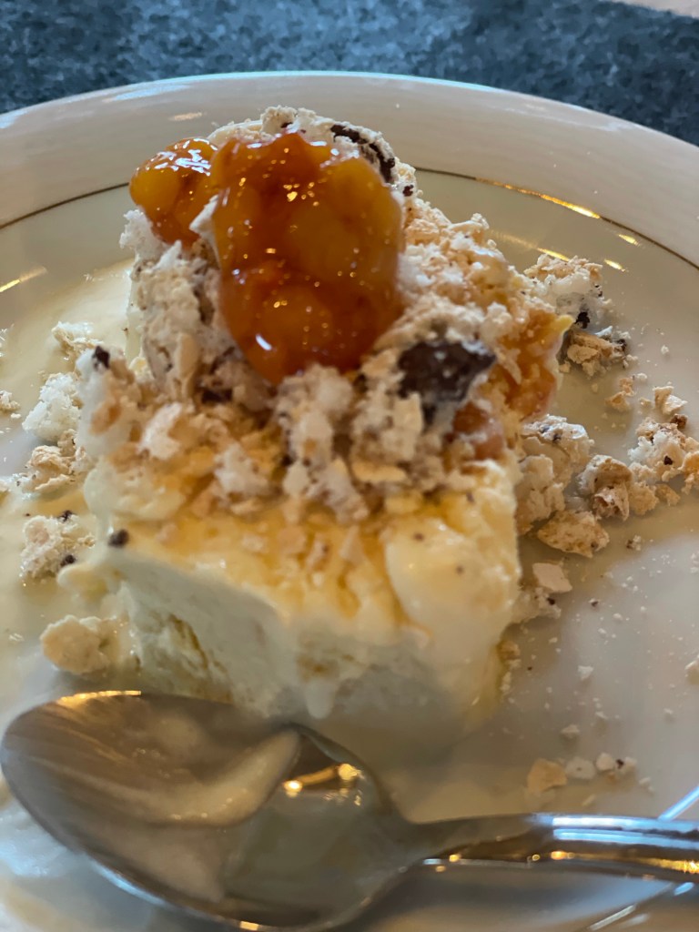 Til dessert fikk vi hjemmelaget multeis med et hint av cognac og flak av kokos og sjokolade. Isen er laget på eggeplomme, fyldig og helt nydelig.